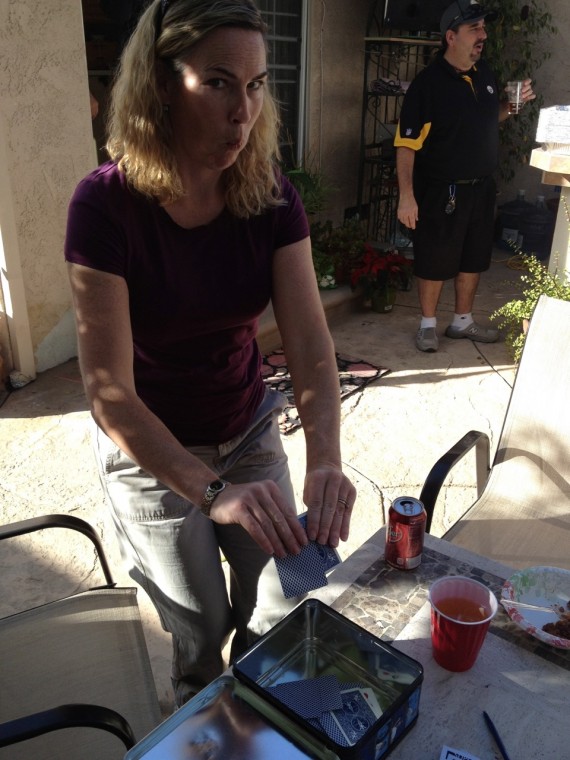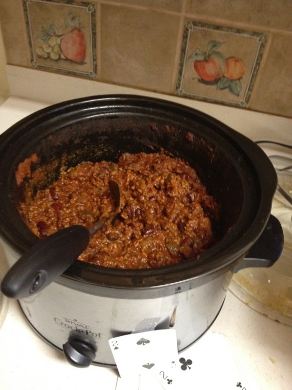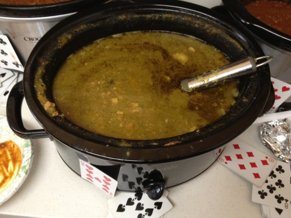 Either way, I attended an awesome, violence-free Superbowl party Sunday, unless you count the beating my tongue took when I tasted the 5-alarm chili verde that was part of the new annual chili cook off that precedes the beginning of the game. This was the second year in a row that the chili opened for football at the party we always attend in Granada Hills.