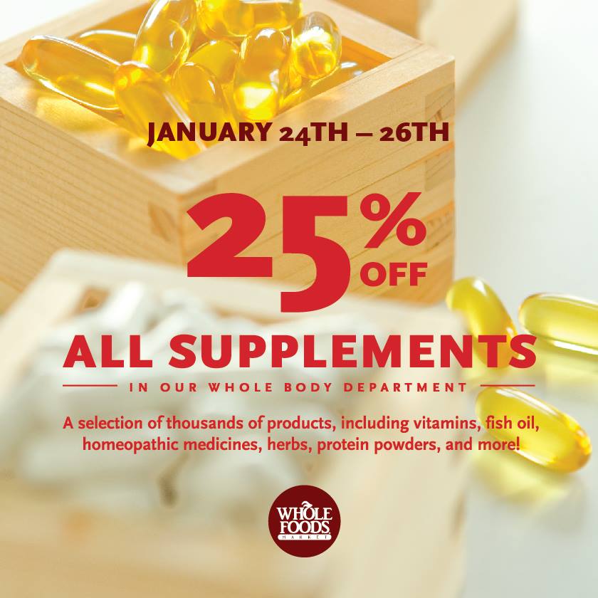 At our area Whole Foods Markets, all ALL supplements are on sale this weekend – 25% off! That means proteins, Meal Enhancers, superfoods (chia, flax), probiotics, vitamin A to zinc and everything in between. Starting tomorrow Jan 24 and going through Sunday Jan 26, you can take advantage of the lower prices to stock up!