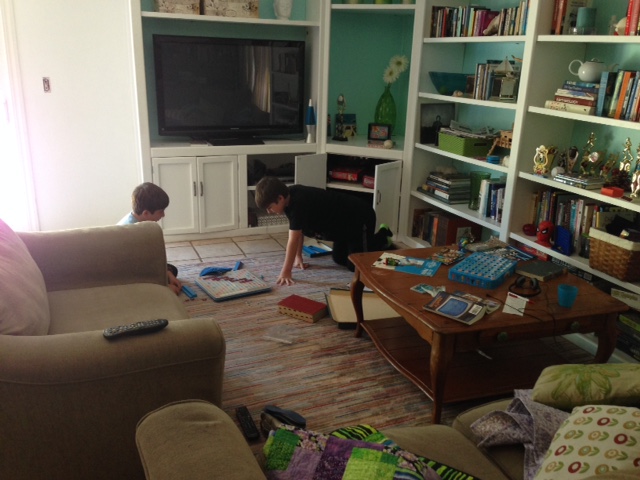 And then one started whining that he wanted a friend to come over, so I texted around and found him a playdate. But a threesome always makes for one whiny brother who usually ends up in tears, so I found another friend who was willing to host him. Now we’ve got games spread all over the house. Inventory: 2 happy kids, one off site playing with friends.